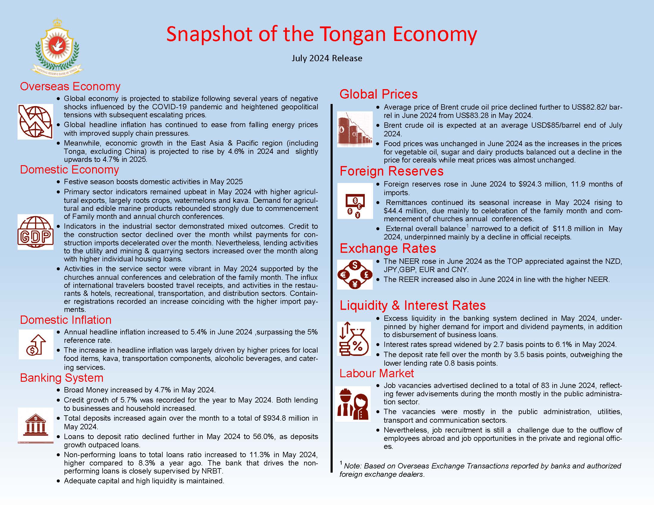 The NRBT has projected a moderate growth of 2.6% for Tonga’s economy for the FY 2025. Major infrastructure projects, an anticipated influx of visitors for events such as the Pacific Islands Forum meeting, and the annual local festivities are expected to help contribute to this growth. Headline inflation has slightly risen above the 5% reference rate in June 2024 as strong demand for domestic food prices drove up prices. However, it should also be noted that this high inflation is expected to be transitory as the festive season ends. However, if the domestic supply imbalance persist, the headline inflation may remain above the 5% reference rate for an extended period. A greater collaboration between Monetary and Fiscal Policy will need to be implemented to address lingering local supply and demand concerns. The risk to the outlook is also tilted to the downside with the ongoing wars in the Middle East region and the potential disruptions on global trading activities. Foreign reserves, are still at comfortable levels and projected to remain above the IMF’s prescribed level of 7.5 months of imports cover in the near to medium term. The financial system maintains stability with high liquidity and banks holding sufficient capital reserves. However, one financial institution is under close supervision, highlighting the need for vigilant oversight to uphold this stability. The Reserve Bank is currently reviewing its monetary policy tools in light of the current macro-economic conditions to continue and ensure price stability as well as financial stability.