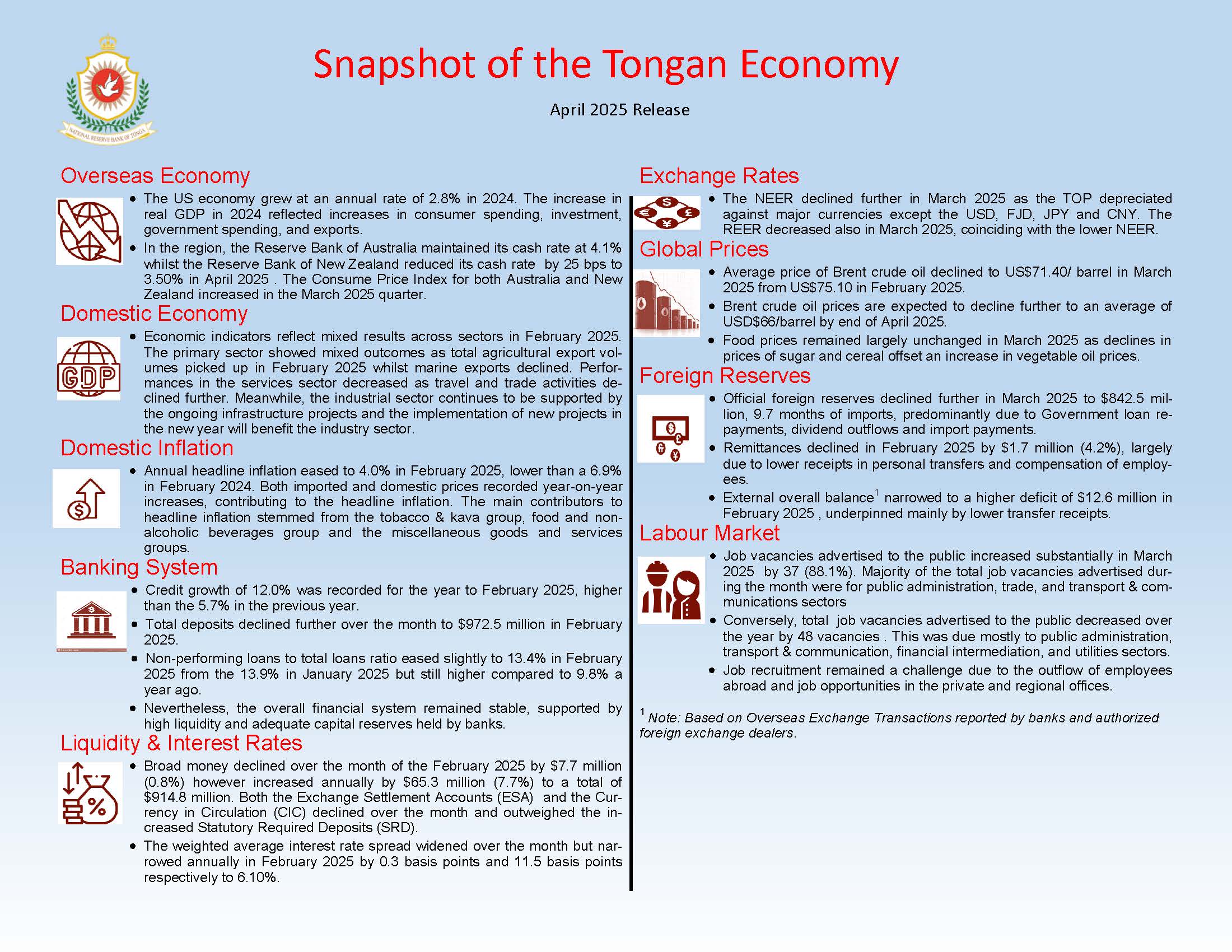 Headline inflation fell below the 5% reference rate, settling at 4.0% in February 2025, which is a decline from 5.4%in the previous month, and 6.9% in February 2024. However, both imported and domestic prices recorded year-on-year increases, contributing to the headline inflation. Imported inflation contributed around 1.7 percentage points to the headline inflation, largely driven by goods for personal care, imported food items, furnishings & household items, and clothing & footwear. Meanwhile, domestic prices contributed around 2.3 percentage points, fueled primarily by kava Tonga, local food items, and food & beverage serving services.
