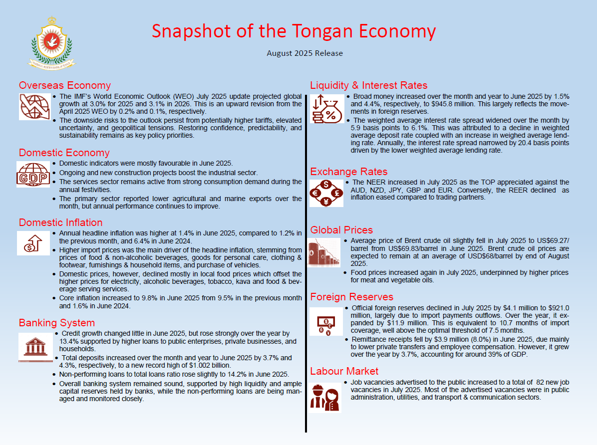 Economic recovery is underway for the Tongan economy supported by fiscal expansionary measures and easing inflationary pressures. Nonetheless, the weakening global economy and elevated uncertainties on trade policies and geopolitical tensions remain as significant risks to both the growth and inflation outlook. Nonetheless, headline inflation is projected to remain below the 5% reference rate, while core inflation remains persistently high at over 9 percent and expected to take longer to converge back to the headline. Foreign reserves fluctuated to its peak over the last 12 months in August 2025. The financial system remains sound, while systemic risks are closely monitored to manage compliance with prudential requirements.