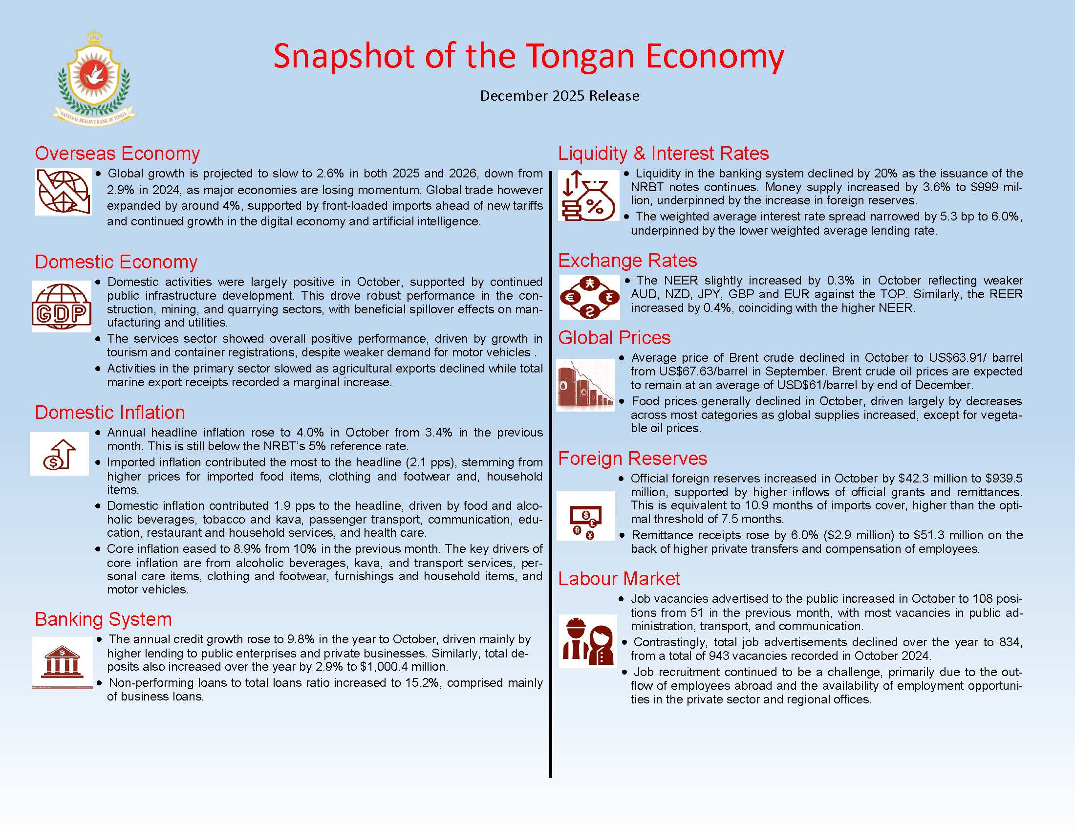 Remittance receipts rose by 6.0% ($2.9 million) in October to $51.3 million from higher private transfers and compensation of employees. Over the year, receipts increased by 6.4% ($33.6 million) to $557.8 million, reflecting stronger support from temporary workers abroad. Majority of remittance receipts are private transfers from family and friends abroad (88.2%), followed by compensation of temporary workers abroad (10.6%). AUD dominated receipts at 42.9%, followed by USD at 34.3% and NZD at 19.7%. The NRBT estimates that remittances represent 40% of GDP, underscoring its importance to the Tongan economy and household welfare.