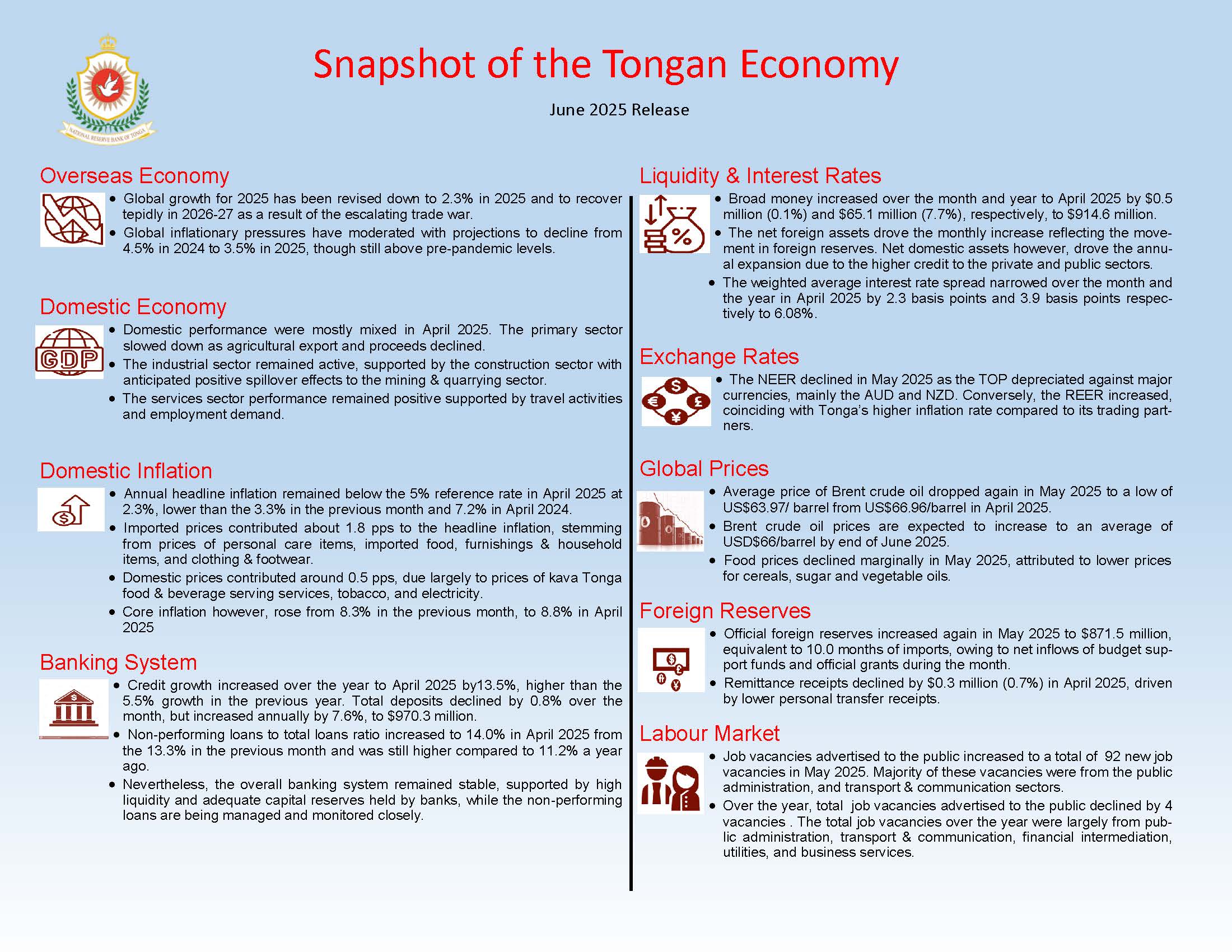 The Tongan economy is showing progress in its recovery, supported by the fiscal expansion and the accommodative monetary policies. The Government’s planned initiatives for the upcoming financial year paints an optimistic outlook for domestic activities, underpinned by increased support for private sector development and greater access to finance.