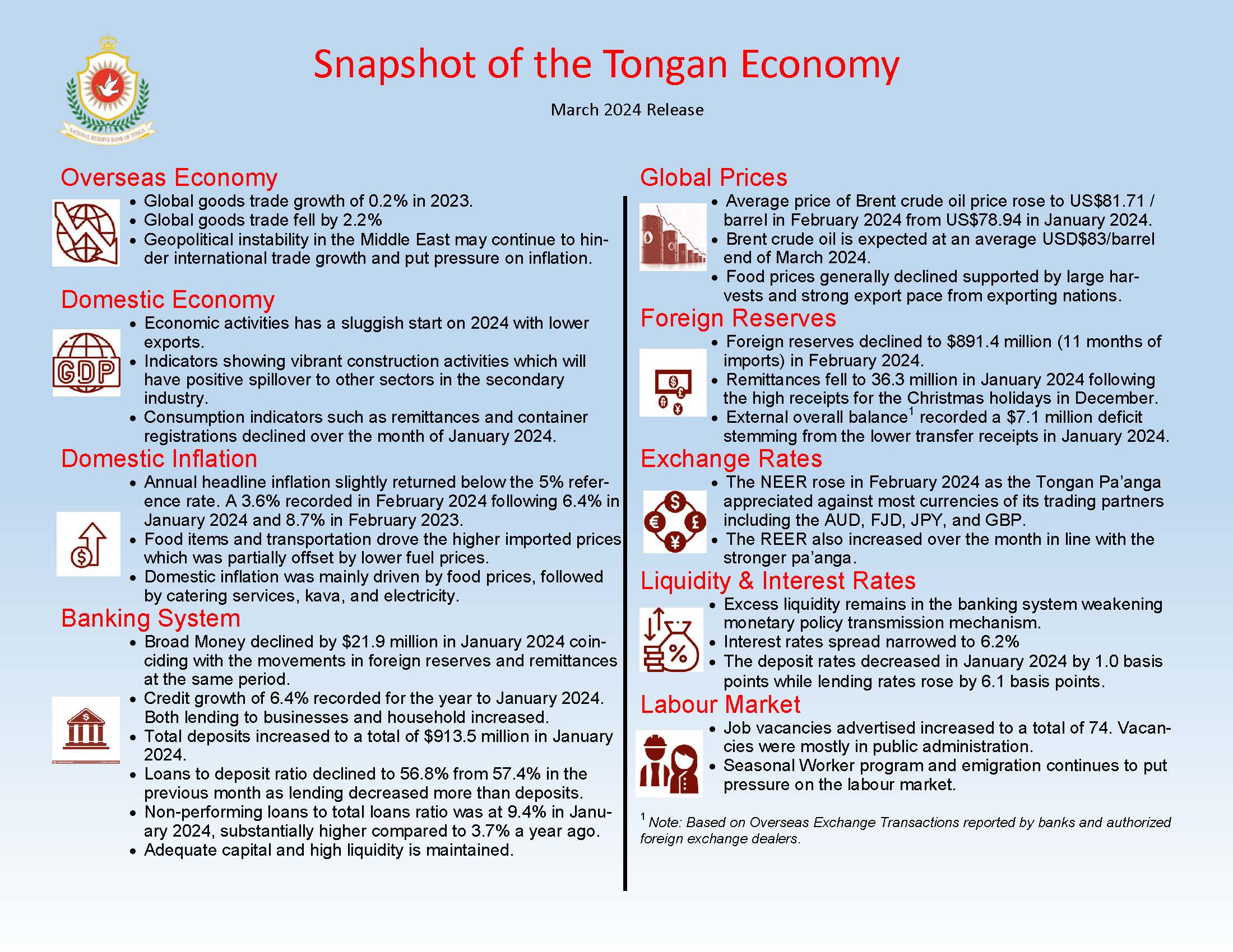 Headline inflation returned below the 5% reference rate in February 2024 to 3.6%, lower than the 6.4% in the previous month and 8.7% in February 2023. The ease in inflation was largely supported by favorable movements in global energy prices compared to the pandemic period. Meanwhile, local food prices eased as demand and spending slowed down following the holiday activities. Nonetheless, imported prices contributed around 1.9 percentage points (pps) to headline inflation with main contribution stemming from international airfares, imported food items, alcoholic beverages, household items, and goods for personal care. Meanwhile, lower prices of fuel, LP gas, and construction materials over the year continued to reduce inflation. On the other hand, domestic prices rose over the year with a 1.7 pps contribution to headline inflation. Key domestic contributors included local food items, catering services, kava, electricity, and operation of personal transport equipment. Contrarily, the price of tertiary education fees, local tobacco, and clothing & footwear declined at annual rate and partially offset the inflationary pressure.