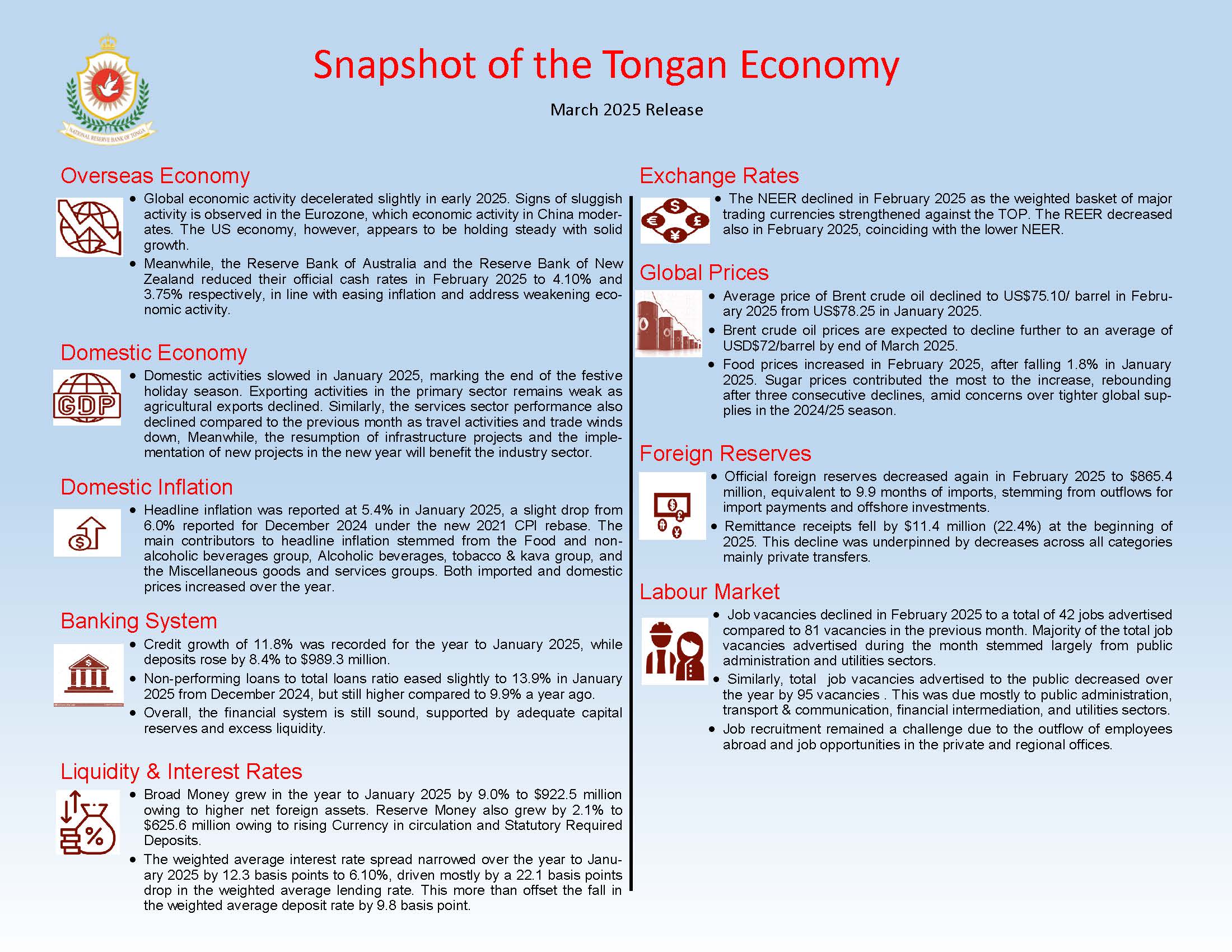 The Nominal Effective Exchange Rate (NEER) declined over the month by 0.1%, as the weighted basket of major trading currencies strengthened against the Tongan Pa’anga. Correspondingly, the Real Effective Exchange Rate (REER) decreased in February 2025 by 1.6%.