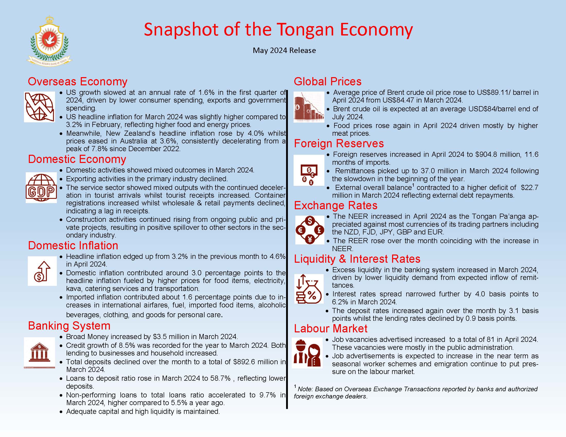 In light of the latest developments above, the NRBT expects the headline inflation to continue remaining below the 5% reference rate for the most part of 2024. An expectation of a stabilisation in the global oil price through the year helps support this forecast. However, geopolitical conflicts such as the ongoing Russia-Ukraine war as well as the escalating tensions between Israel and Iran (including its affiliated groups) may continue to put further pressure on the supply of certain commodities, including petroleum, and may potentially cause ongoing disruptions to important global trade routes. Although the current El Niño event is expected to end this month, its impacts on local food production and extreme weather events will likely be felt right throughout 2024. GDP growth for the 2024 financial year is anticipated to be moderate indicating a gradual economic recovery following both the COVID-19 pandemic and the Hunga Tonga-Hunga Ha’apai eruption/tsunami disaster. Foreign reserves, are still at comfortable levels and projected to remain above the IMF’s prescribed level of 7.5 months of imports cover in the near to medium term. The financial system remains stable, characterized by high liquidity and banks maintaining sufficient capital reserves to withstand potential future shocks. However, one financial institution is under close supervision, indicating a need for vigilant oversight to maintain this stability. The Reserve Bank will continue to closely monitor inflation movements and at the same time support economic recovery.