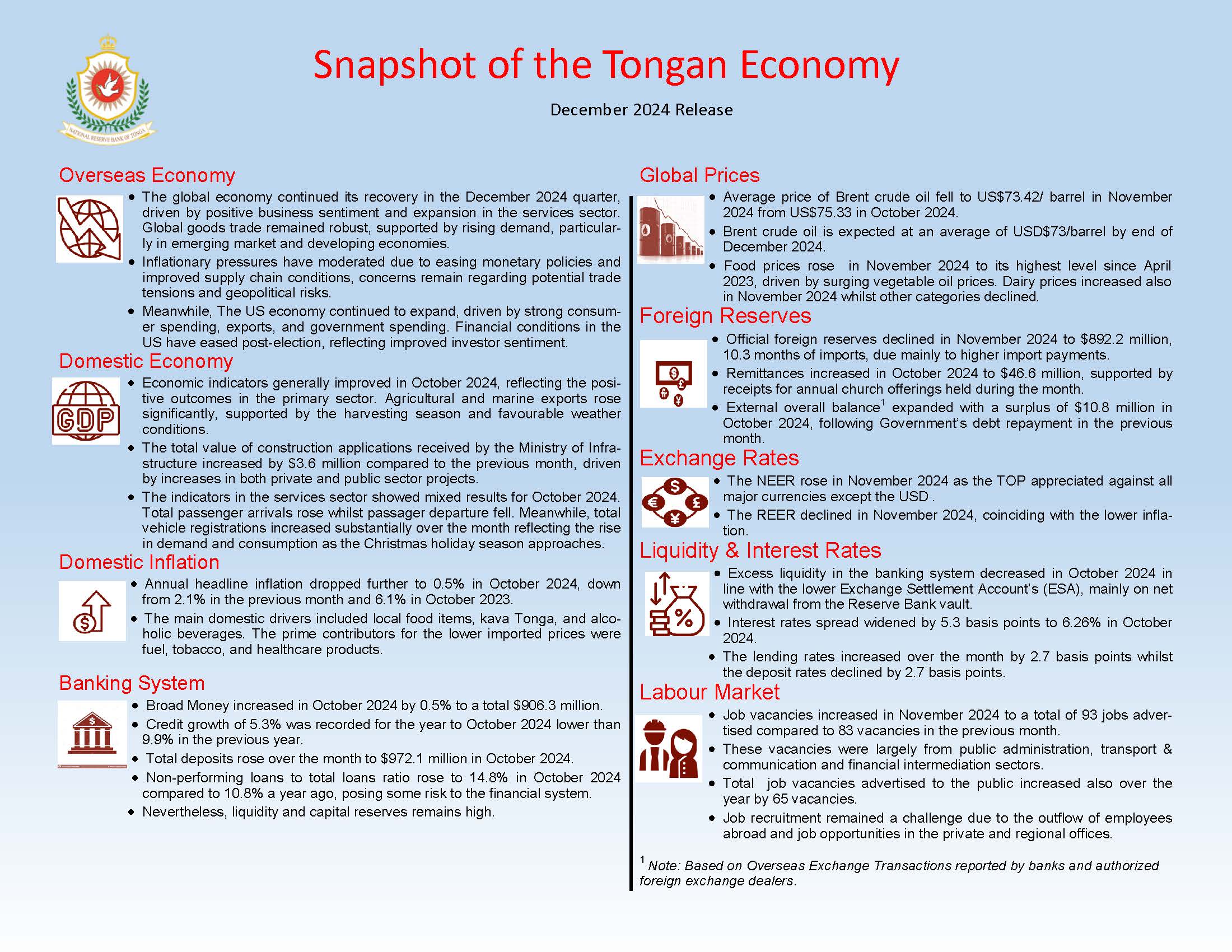 Overall, the global economy is navigating a complex landscape with both positive and negative indicators. Recent escalation of conflicts in the Middle-East may affect growth through higher inflation expectation especially for oil prices. Outlook for the Tongan economy remains positive, supported by infrastructure projects, tourism, and domestic events. However, global geopolitical tensions, potential disruptions to trade, and the upcoming cyclone season could pose downside risks. Inflation is currently below the 5% reference rate but the NRBT continues to closely monitor the inflationary environment and will adjust its policies accordingly. Foreign reserves are expected to remain at comfortable levels, above the IMF’s prescribed level of 7.5 months of imports cover in the near to medium term. The overall financial system maintains stability with high liquidity but risks to asset quality and capital positions are tilted to the downside.