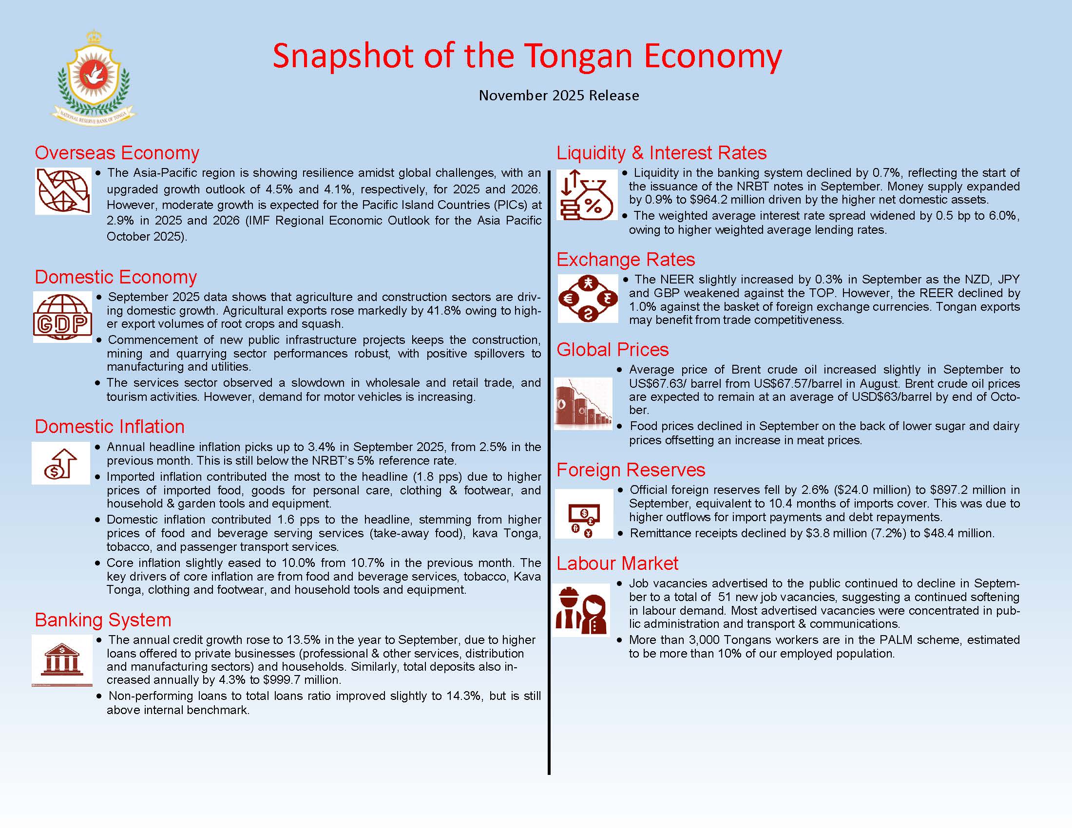 Annually, headline inflation stood at 3.4%, higher than the 2.5% in August 2025 (revised down from 2.8% reported in MEU October 2025). Imported inflation contributed around 1.8 percentage points (pps) to the overall inflation, stemming from increasing prices of imported food items, goods for personal care, clothing and footwear, and household and garden tools and equipment. Similarly, domestic prices also rose and contributed around 1.6 pps to the headline inflation. The increase was mostly in prices of food and beverage serving services (take-away food), kava Tonga, tobacco, and passenger transport services.
