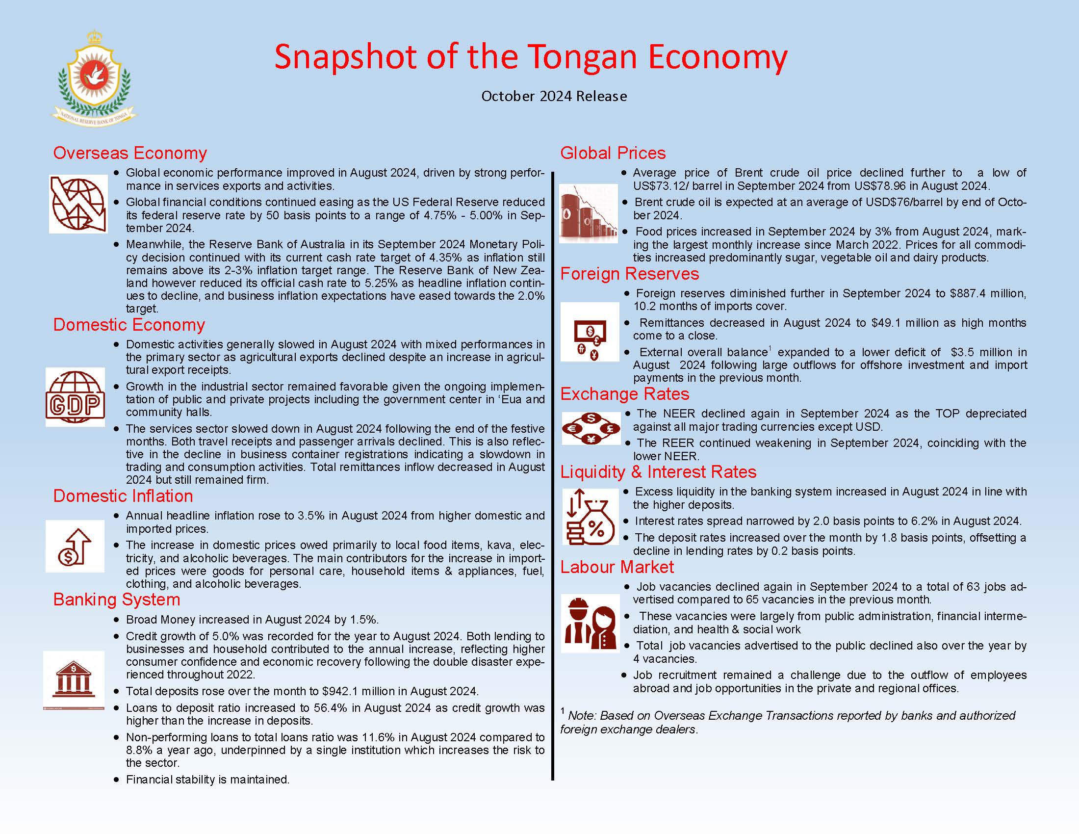 Overall, the global economy is navigating a complex landscape with both positive and negative indicators. Recent escalation of conflicts in the Middle-East may affect growth through higher inflation expectation especially for oil prices. Outlook for the Tongan economy remains positive, supported by infrastructure projects, tourism, and domestic events. However, global geopolitical tensions, potential disruptions to trade, and the upcoming cyclone season could pose downside risks. Inflation is currently below the 5% reference rate but the NRBT continues to closely monitor the inflationary environment and will adjust its policies accordingly. Foreign reserves are expected to remain at comfortable levels, above the IMF’s prescribed level of 7.5 months of imports cover in the near to medium term. The overall financial system maintains stability with high liquidity but risks to asset quality and capital positions are tilted to the downside.
