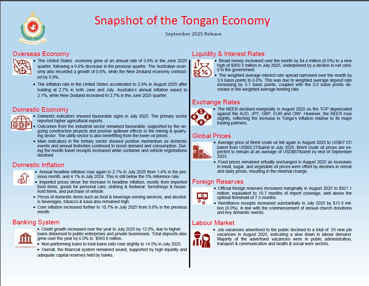 Partial indicators of the industry sector are mostly positive. Loans to the construction sector recorded an increase of $0.9 million (4.3%), while lending to the utilities sector rose by $0.06 million (18.8%). These positive credit trends reflect the ongoing construction activities associated with the Tonga Climate Resilient Transport Project II (TCRTP II), Upgrade of Queen Salote Wharf, the new parliament house, and other private projects. At the same time, construction import payments also showed an increase of $0.2 million (4.4%) in July 2025.